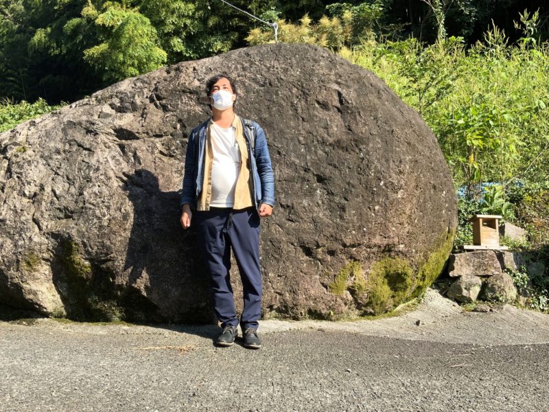 みかん畑の合間に、どんと構える2つの巨石「奇跡の夫婦石」。残念ながら今の時期は古い方の岩が草で見えませんが、もう少しすると仲良く並ぶ姿が見えるそうです。以前はしめ縄で繋がれていたりもしたそうですよ。