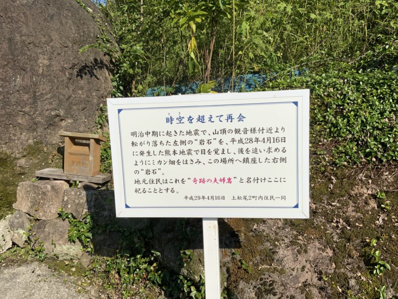 近くにいた地元のおじいちゃんに聞くと、「震災んときに落ちてきて、あんまり大きいもんだけん、片付くっとも大変かなぁて。昔の地震で落ちてきたって聞いっとた岩と並んどったけん、奇跡の夫婦岩て祀ることにしたと」とのことです。
