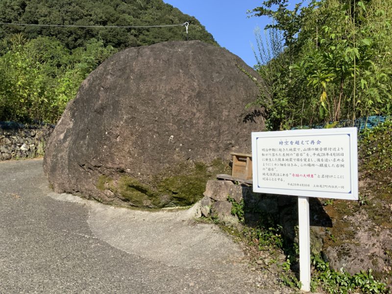 先程の草に埋もれていたほうの岩石が明治中頃の地震で落ちてきて100年以上この場所にあったそう。そして、2016年の熊本地震で初めに私が並んでいたほうの岩石も落下してこの場所に。