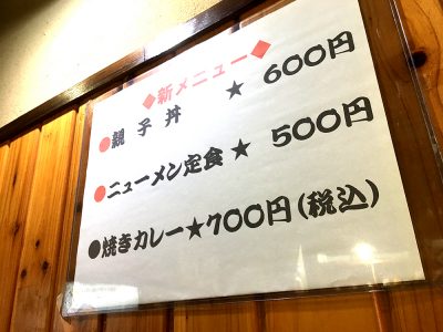 テーブルにはメニュー表がない模様。確認する限りでは、新メニューとあった壁のメニューと、入り口に貼り出してあった定番メニューという限定スタイルのようです。
