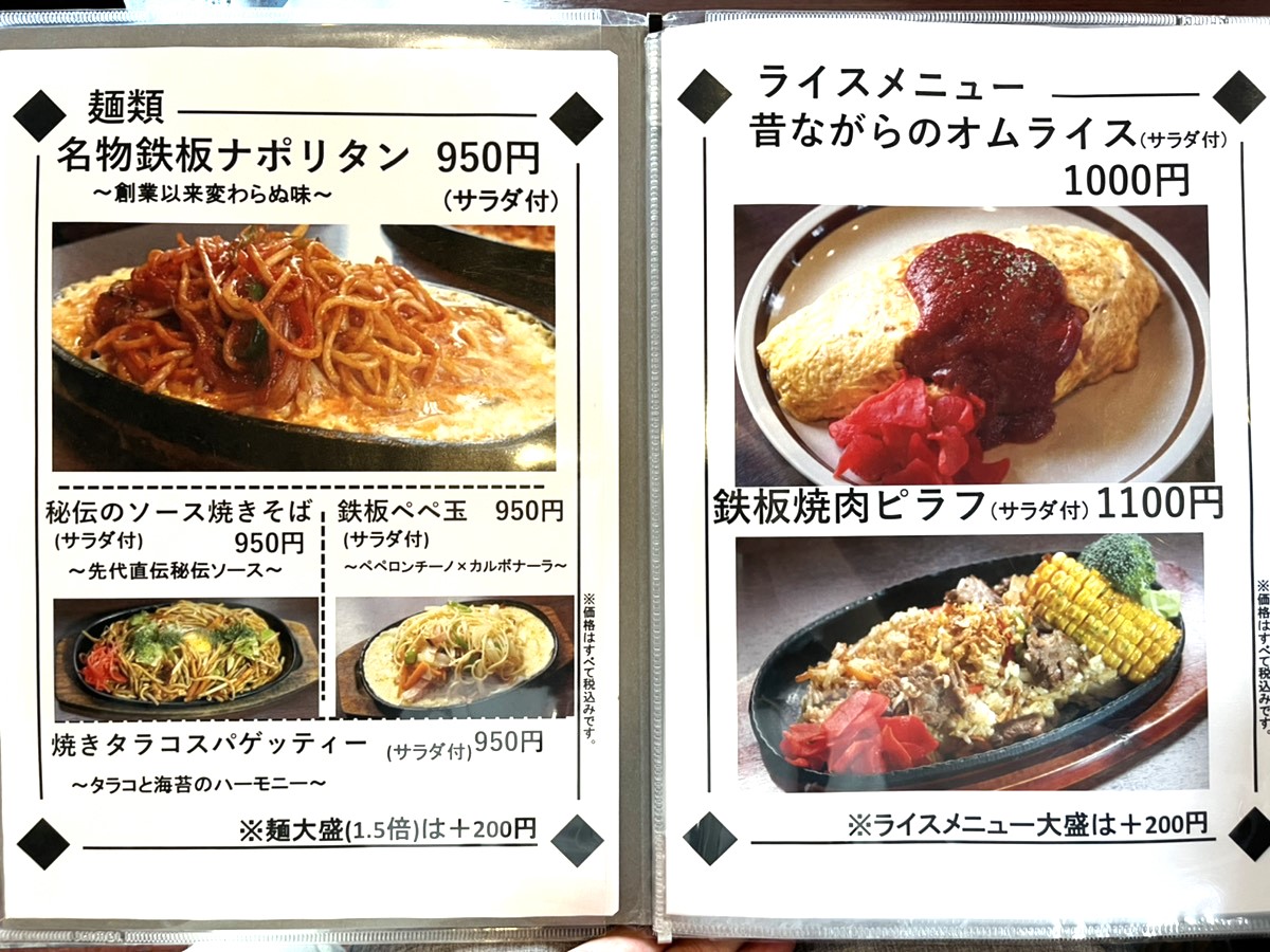 メニューはこちら。メニュー表は新しくなっていましたが、人気メニューの鉄板ナポリタンなどは健在です。嬉しいですね。