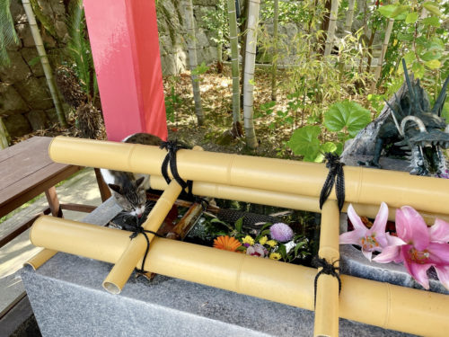 花手水がきれいだな、と思っていたら、さっきの猫が全力で水を飲んでいました。かわいい。
