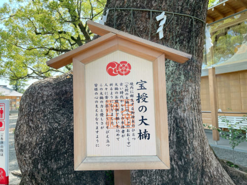 境内には夫婦楠のほかにもたくさんの巨木が立っています。そのひとつ、本殿の近くにある大きなクスノキが「宝授の大楠」。