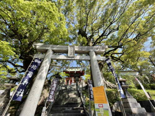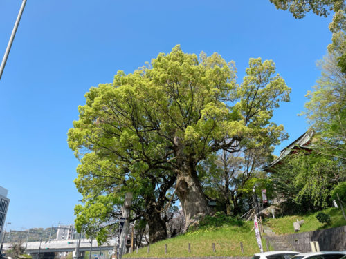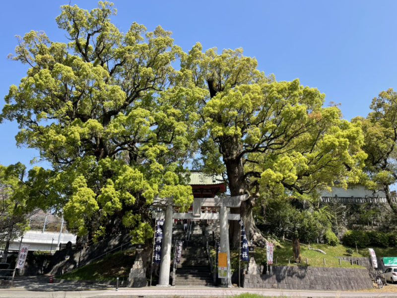 JR熊本駅近く、花岡山(はなおかやま)の麓に位置する北岡神社。道路から大きなクスノキが全開で見えています。かっこいい。