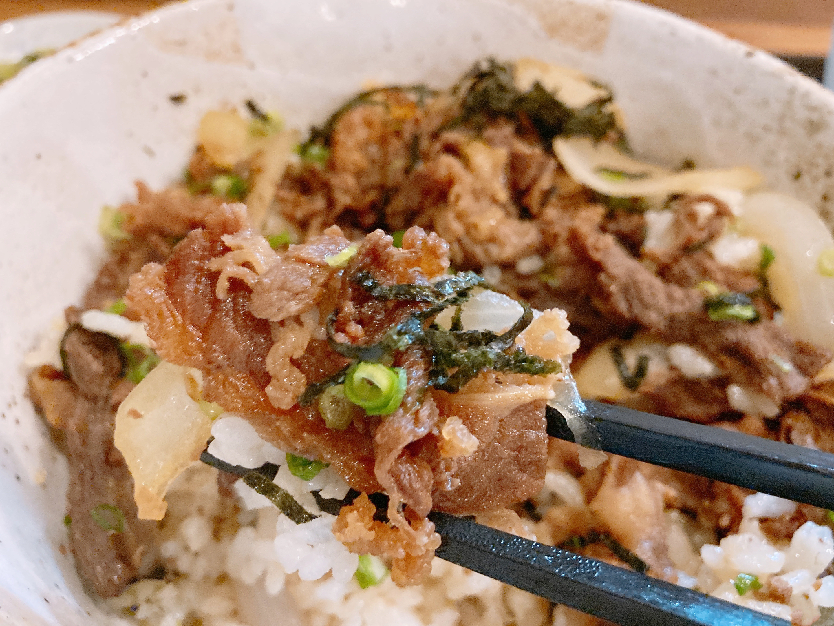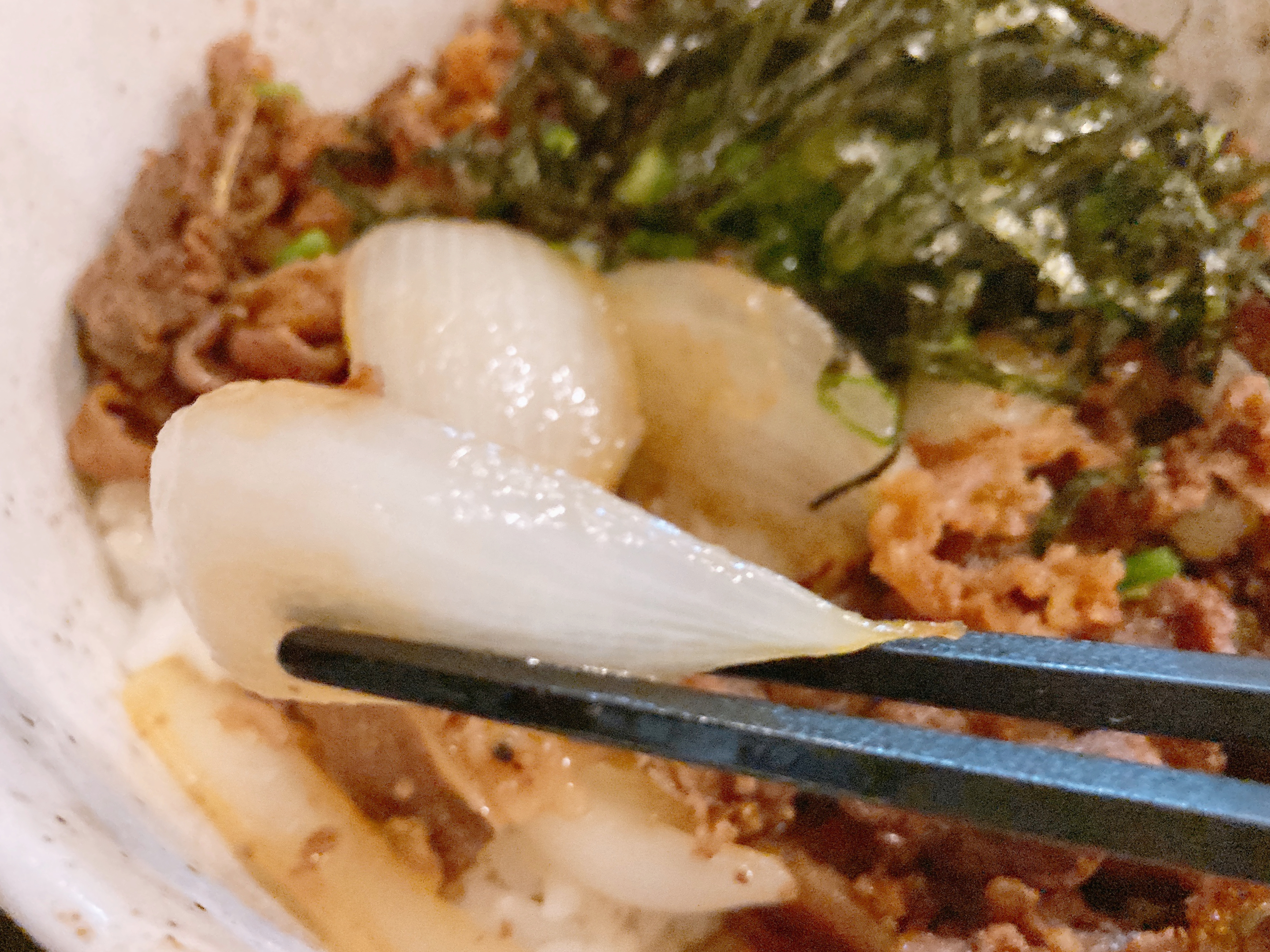 肉めしには大きめの玉ねぎが入っているのもいいんですよ。ちょっとでも野菜も摂らないと。