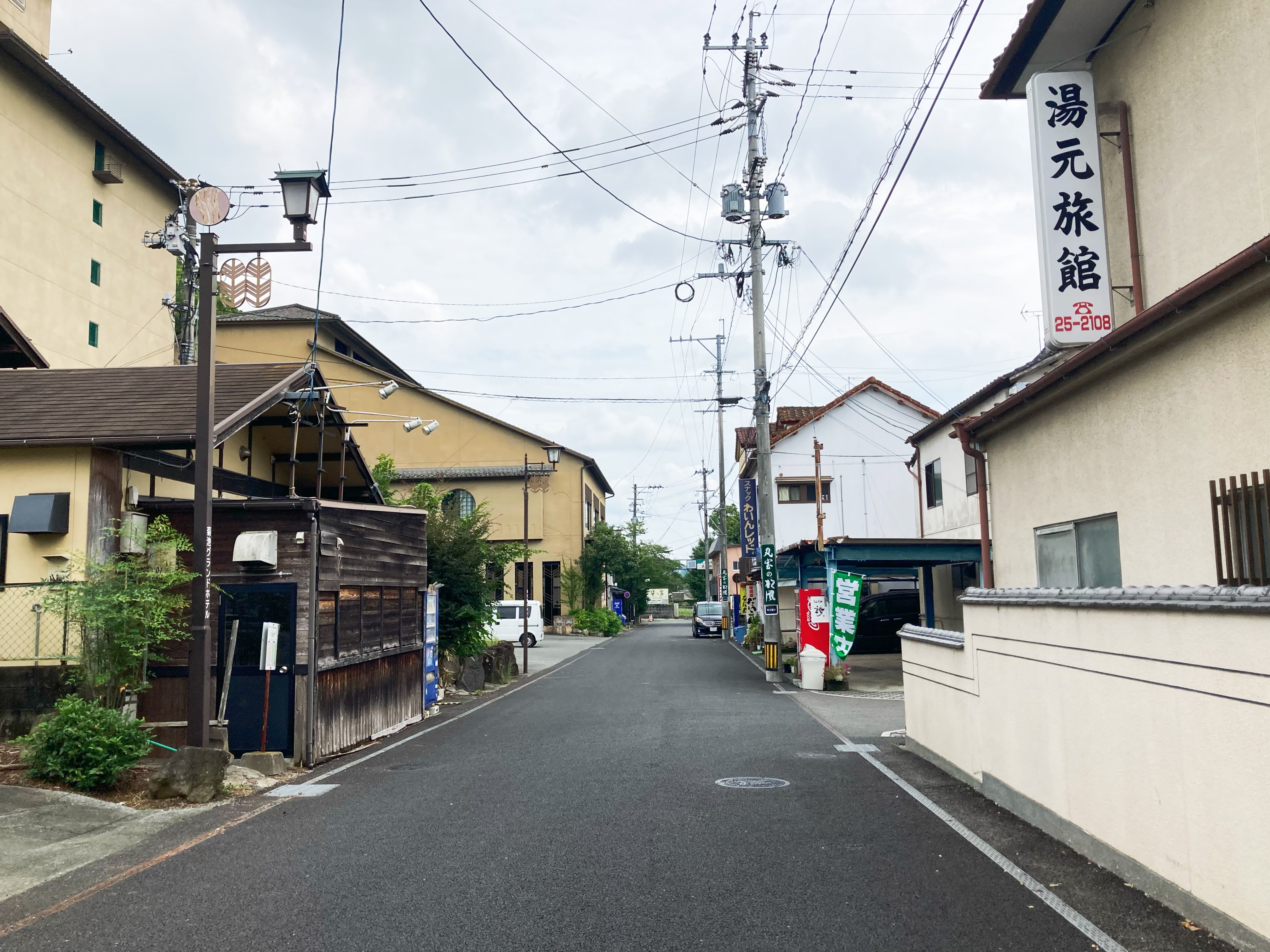 菊池の方に教えてもらったランチスポットがあるのは菊池温泉、旅館が多くあるエリアです。この通りから行きましょう。