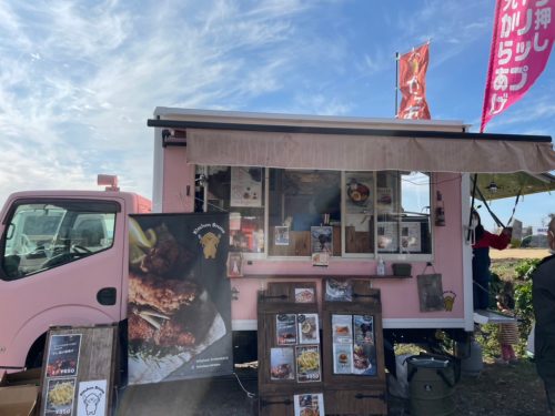 タレ漬け唐揚げの「Kitchen Bruna」は、かわいいピンクのキッチンカー。