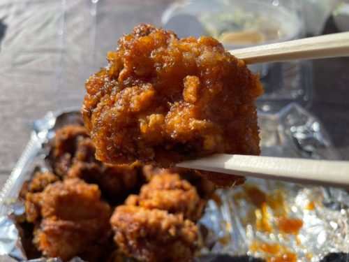 そのほか、鶏肉を甘酒とこだわりの塩で漬け込んで揚げたという塩唐揚げもあります。こちらは国産ムネ肉を、スペインとチベットのミックスの岩塩、甘酒、にんにくや生姜などにしっかり漬け込んで揚げたというこだわりの唐揚げ。いろんな味の唐揚げを思いっきり堪能できるキッチンカーです。