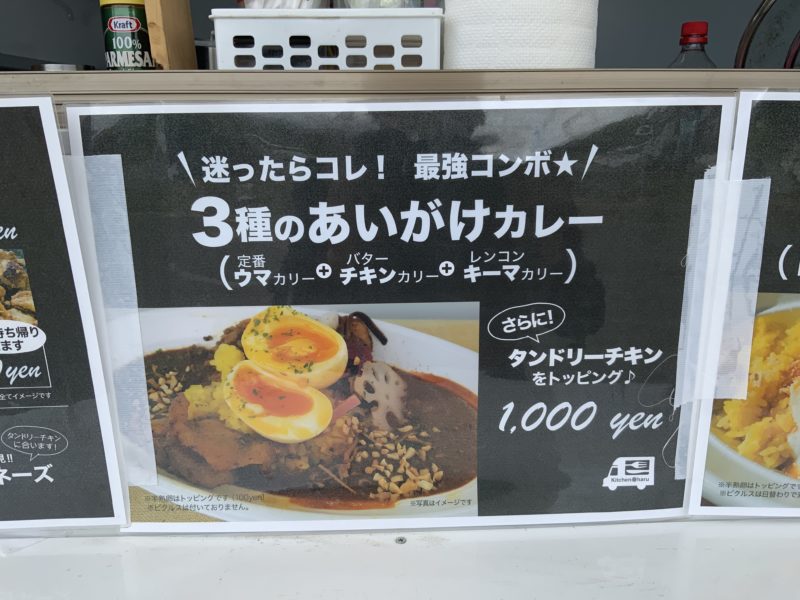 トッピングも半熟卵、キーマカレー、タンドリーチキンの3つ。全部100円です。辛味スパイスや粉チーズ、マヨネーズは無料で追加できます!