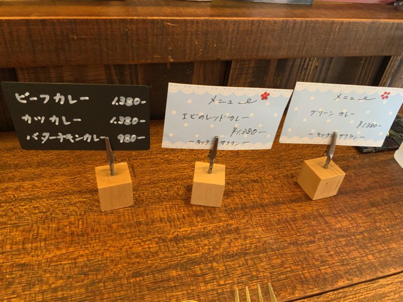 メニューは欧風のビーフカレー、カツカレー、バターチキンカレーに、ココナッツをベースにしたタイカレーのエビのレッドカレーと、グリーンカレーの5種類。