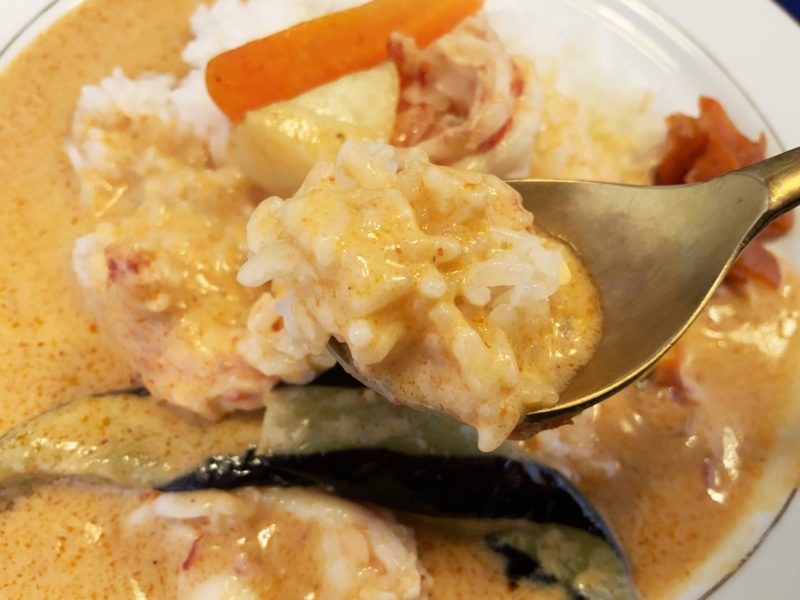 ルーからは香辛料のいい香り。食欲をそそります。合間からエビとナスがこんにちは。