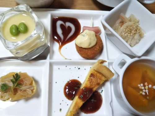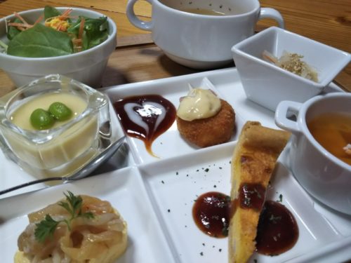 このランチセットは、6種のオードブルプレート、サラダ、スープ、オムライス、デザート盛合せ、ソフトドリンクといった内容。