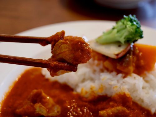 チキンは箸でホロリと切れる柔らかさです。カレールーは、スパイスカレー全盛期の今、意外なほどやさしい味わい。