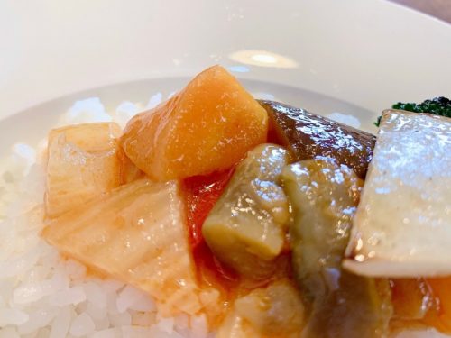 カレーの付け合わせ野菜と言えばお漬物風のアチャールかなと思いきや、酸味はなく、ほんのり甘みも感じるトマト味。ナスにセロリ、カブ、ブロッコリー、パプリカ等たくさんの野菜が入ったカポナータでした。