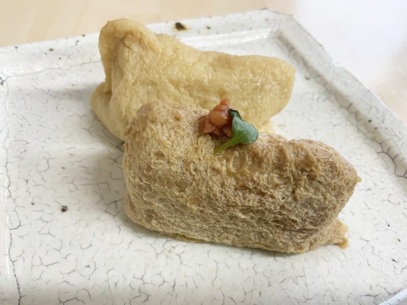 手前が「お味噌稲荷」。もろみが乗っています。3種類の県産味噌をブレンドし、和をイメージしたほっこりとした味わいになっているそうです。