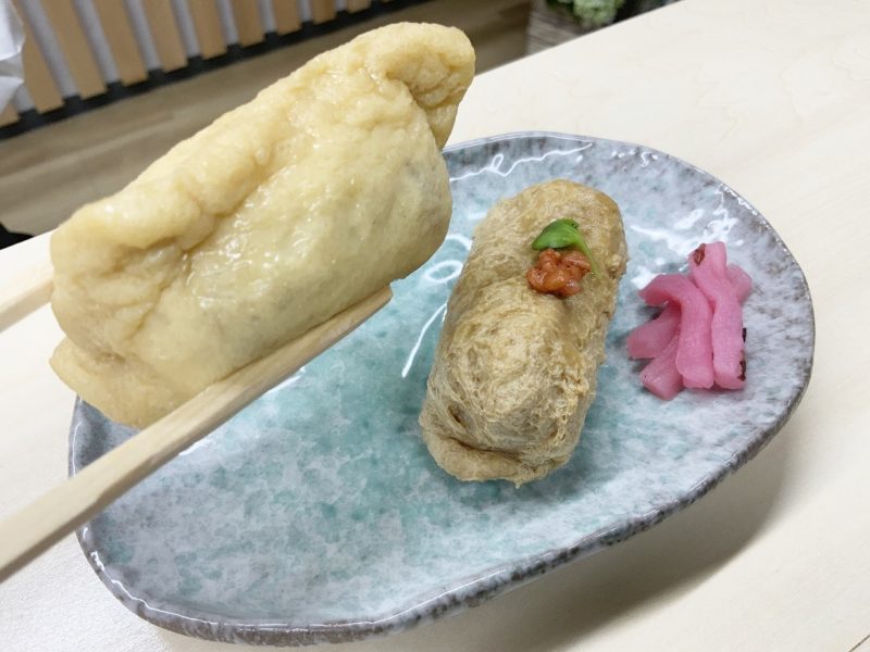 奥の「お出汁稲荷」は、和こんぶ、しいたけ、いりこ、かつお節からとった一番出汁を使ったもの。どちらもとにかく素材に拘っています。