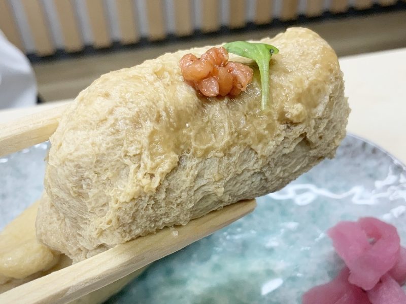 お出汁稲荷は一口食べると、口の中にじゅわっと出汁が広がります。もう本当に、じゅるっじゅる。