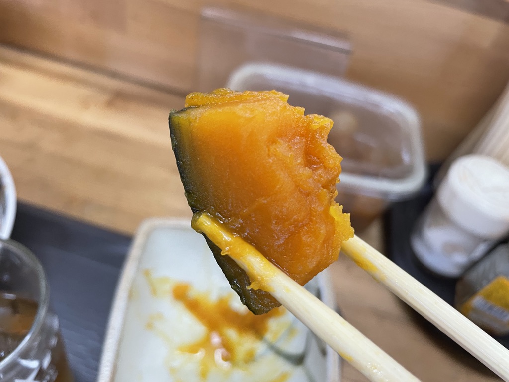 かぼちゃ煮付けは、よく味がしみて適度なヌチャ感がたまらん逸品。