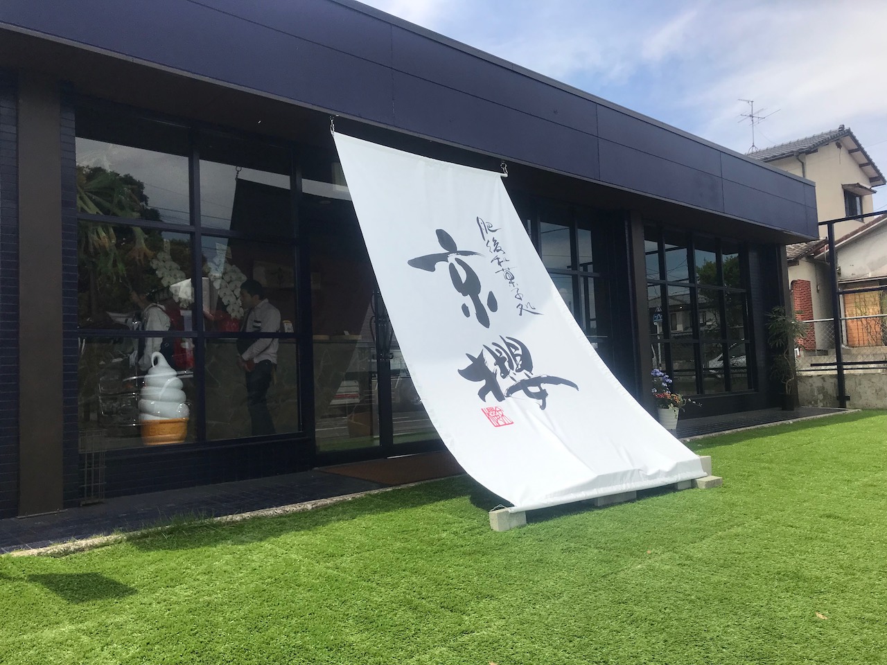 明るい芝生と印象的な大きな暖簾が目印。この文字にも拘って書道家の方にお願いしたそうです。