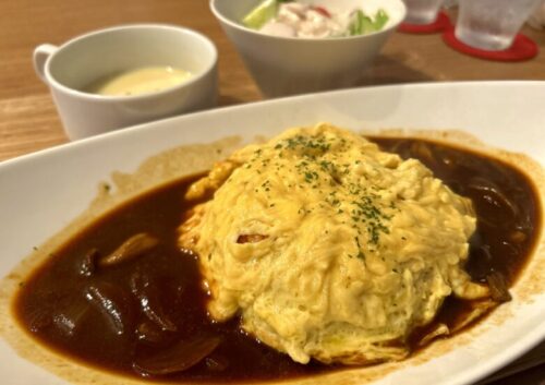 続いてオムライス!こちらもサラダとスープ付きです。