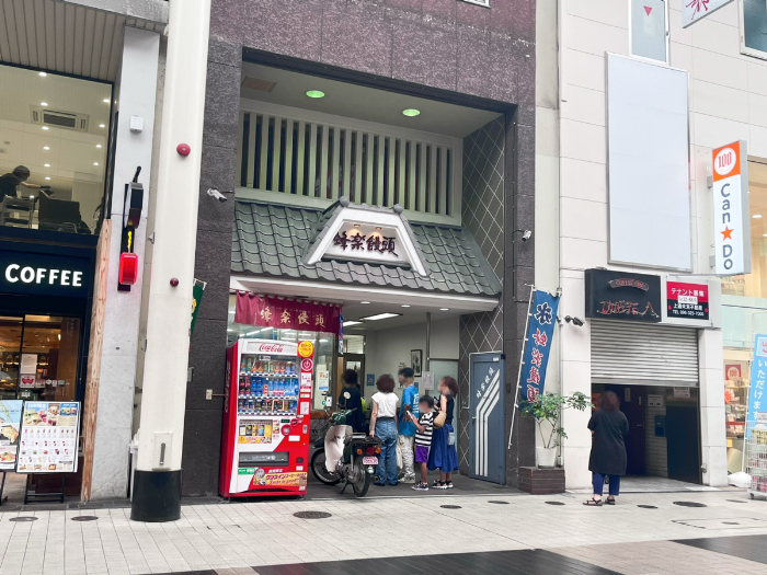 かき氷が復活したと知って、上通アーケードにある「蜂楽饅頭」へやってきました。平日の午後ですが行列が。大人気。