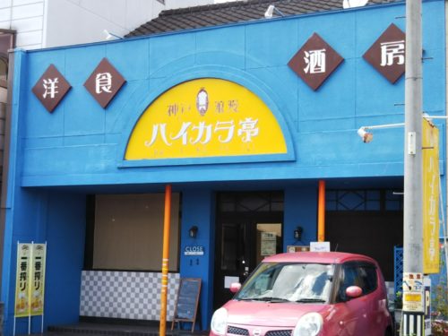 大津にある「神戸浪漫 DINING ハイカラ亭」は、青色と黄色が印象的な外観。