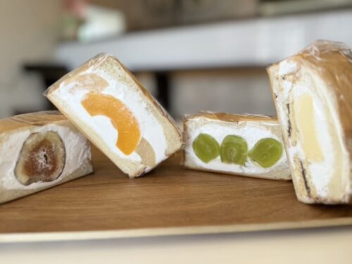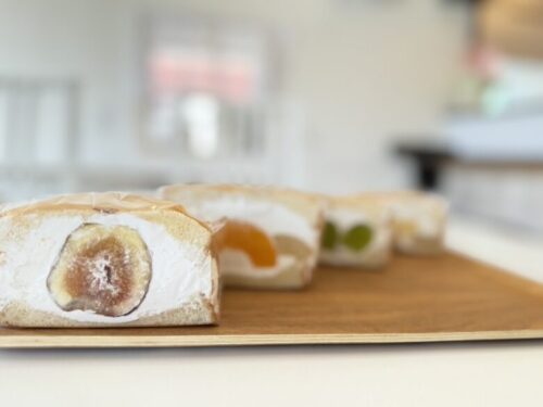 季節のフルーツを、パンとたっぷりのクリームで挟んであります。