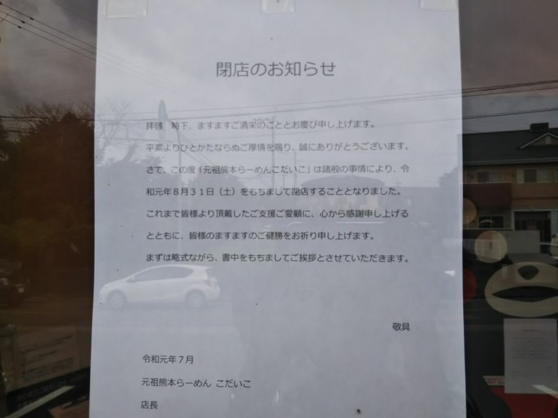 現在、合志市須屋の「こだいこ」にいくと、閉店の張り紙が。8月31日をもって閉店するそうです。