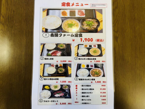 メニューはこちら。馬尽くしの定食のほか、馬すじうどんやお子様カレーなどの単品メニューも。お酒やソフトドリンクも揃っています。