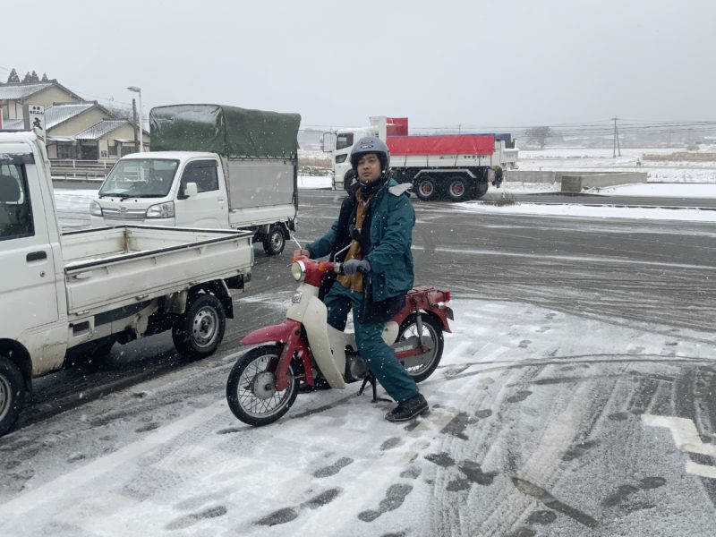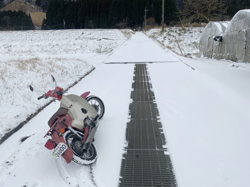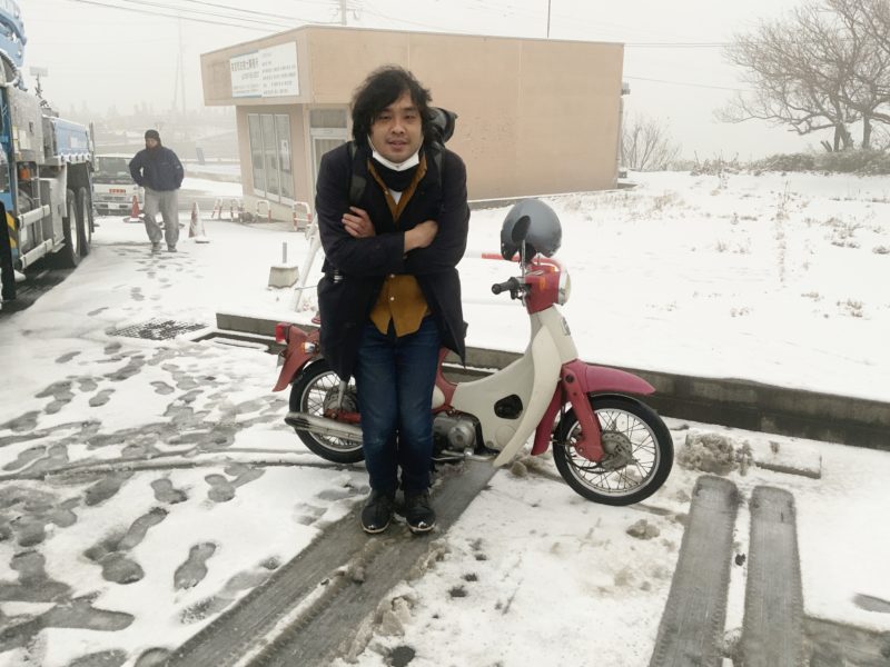 何故か50ccの原付で雪の積もる阿蘇にいます。
