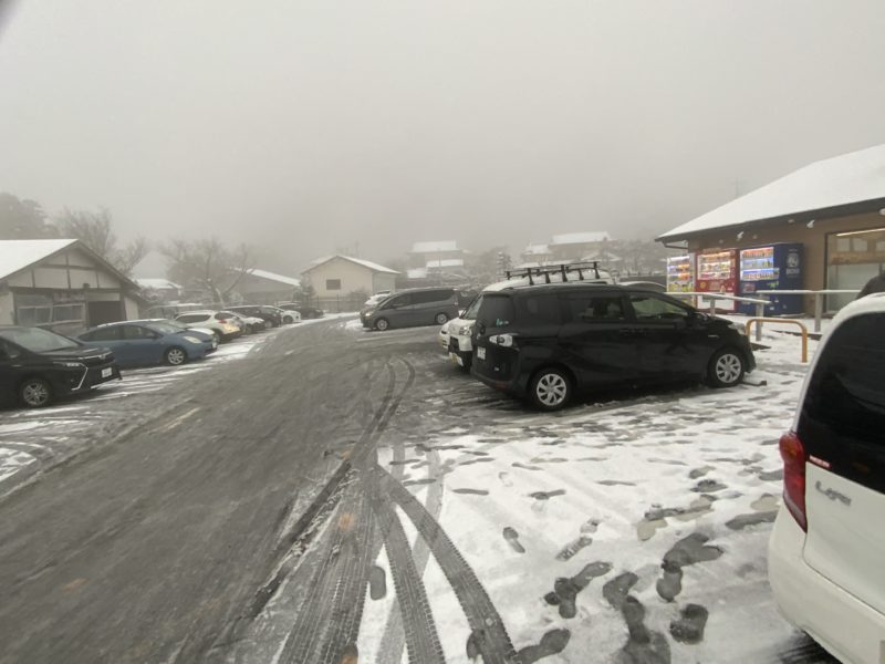 熊本市内では冷たい雨でしたが、大津辺りから雪が積もりはじめ、立野に向かう途中で謎の渋滞。