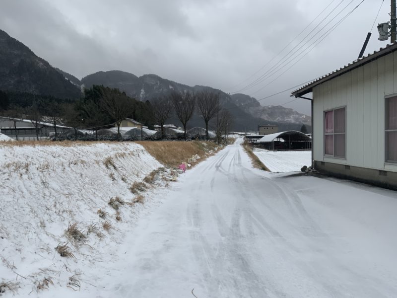阿蘇市に入ってもひたすらこんな感じ。いつも原付き取材のときは路肩に駐めて道路の写真を撮ったりするのですが、その路肩に入る勇気が出ないくらい雪が積もってました。