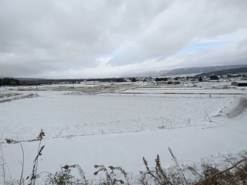 阿蘇の豊かな田園風景も雪化粧で純白に染まっています。