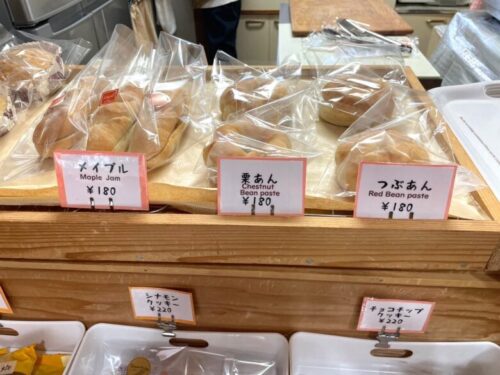 つぶあんに栗あん、メイプル、フォカッチャ、クランベリーパンなどがあり、価格はすべて180円。