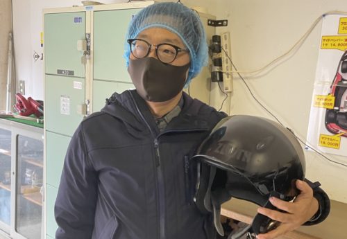 ヘルメットを被ります。ここは、給食のおばちゃんになってしますので、こっそりヘルメットかぶるのが吉。