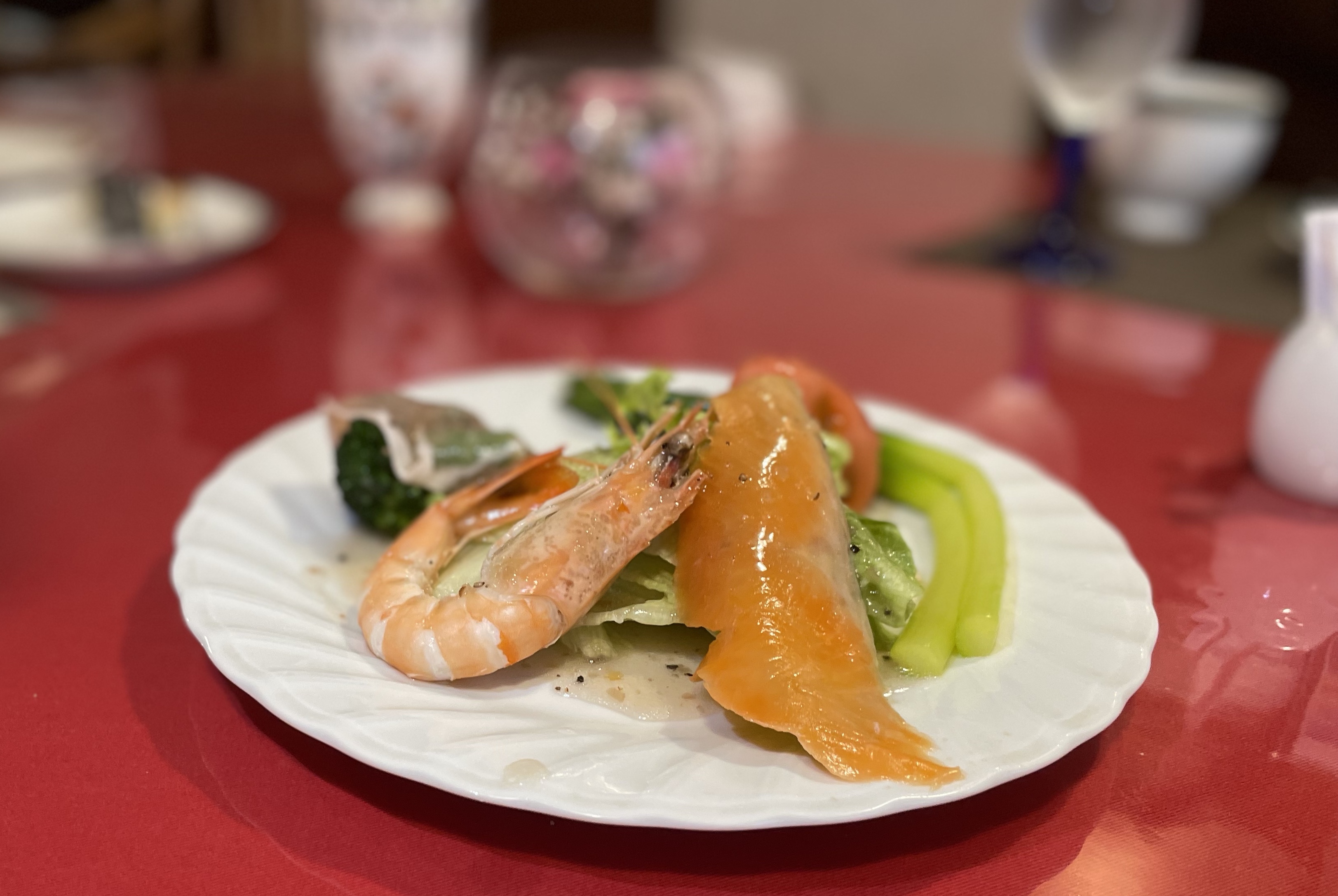 また、お上品で美味なんですよ。エビとサーモンのサラダ、サーモンの向こう側にいる緑のクニャッてしたのはアスパラガス。根元まで柔らか。