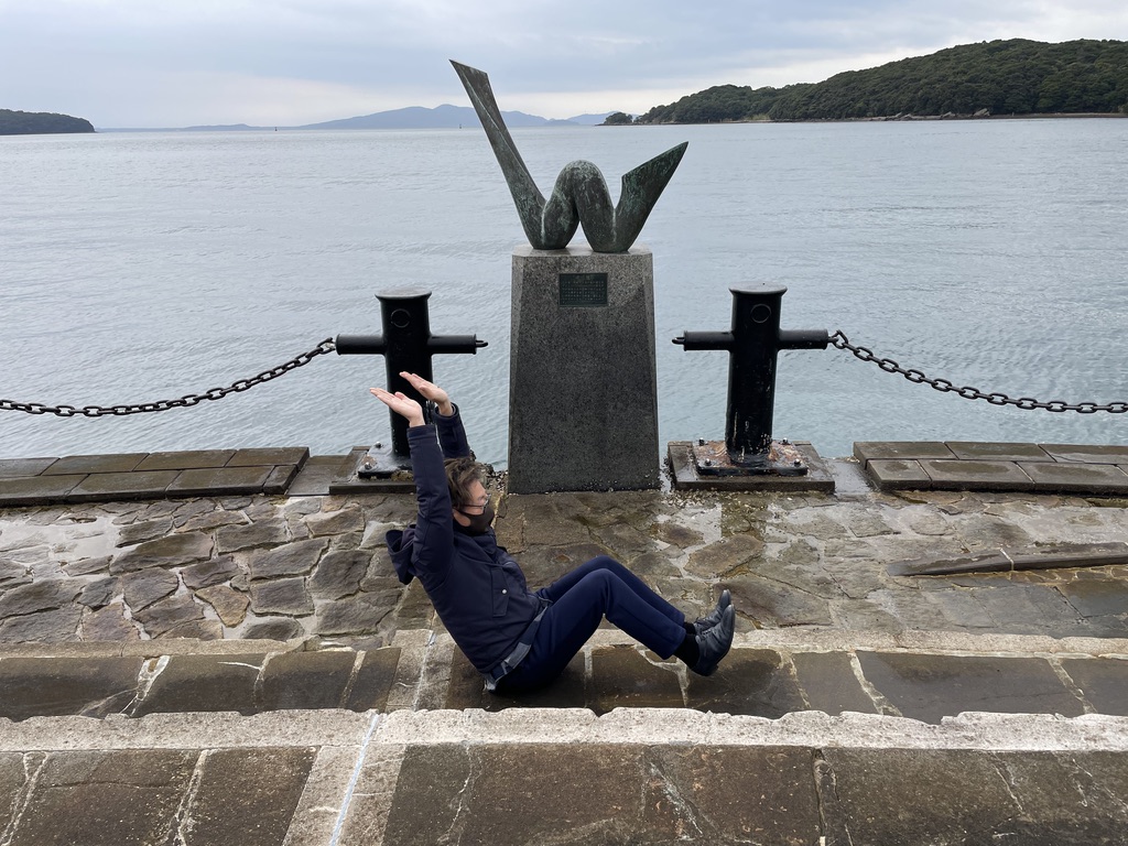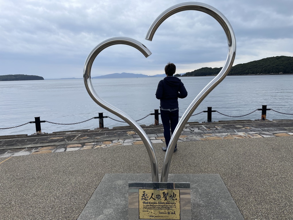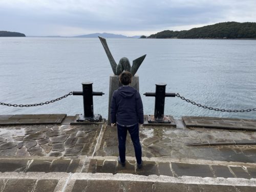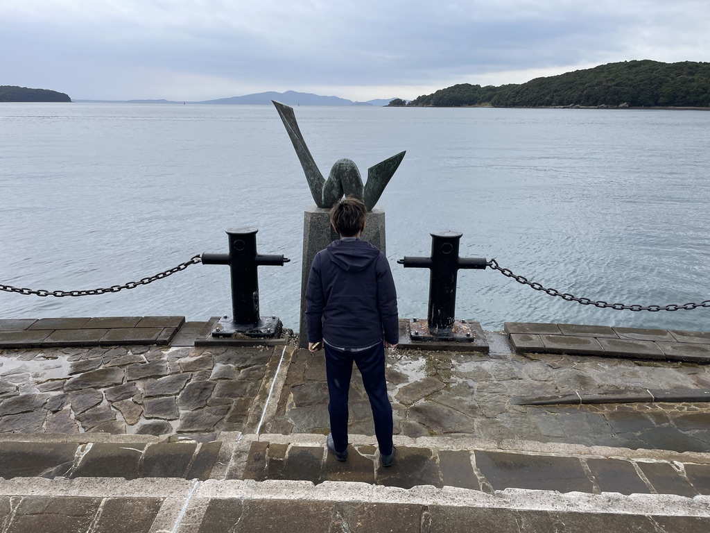 これは「飛龍」という像。向こうに見える島は、恋路島。
