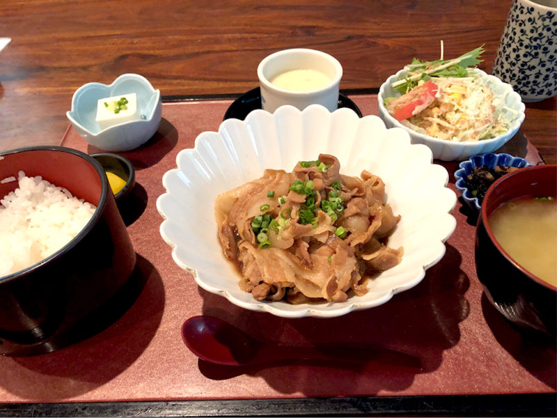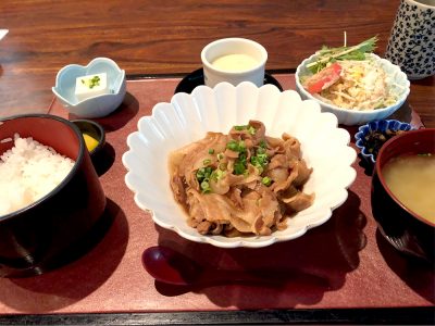 内容はメインの豚肉の生姜焼き、ごはん、サラダ、味噌汁、冷奴、茶碗蒸しです。品数の多さに圧倒されました。
