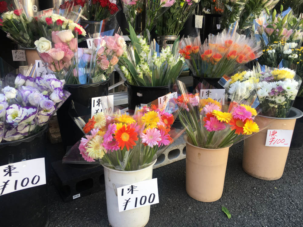 バラ5本100円、アスパラ2束100円、いもまんじゅうとかぼちゃコロッケ2個で100円。