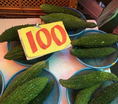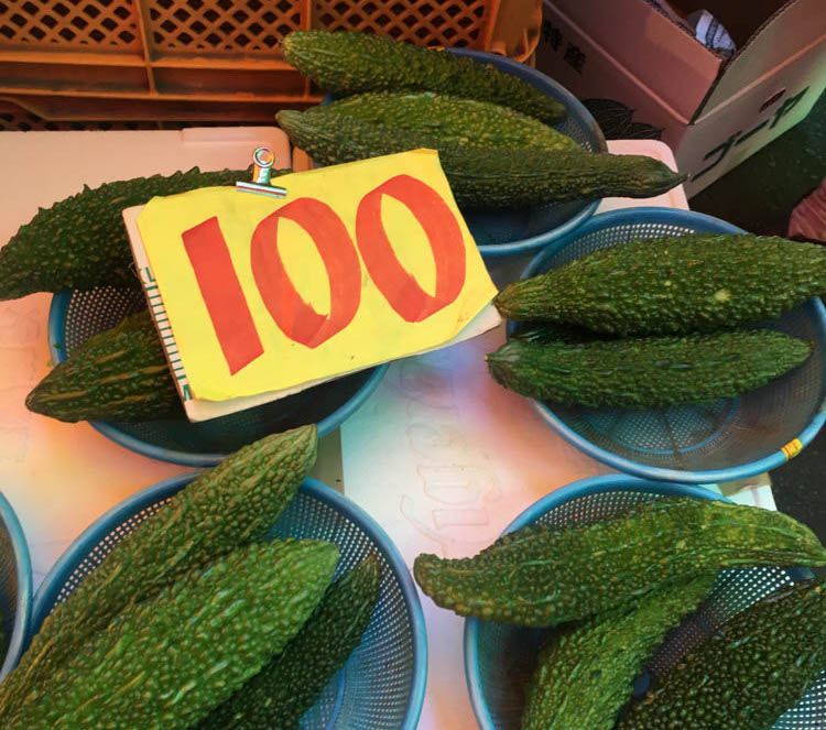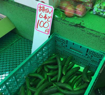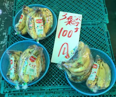 ゴーヤは3本で100円。バナナも3袋で100円。きゅうりは6本で100円と、どれも常識を超える安さです。