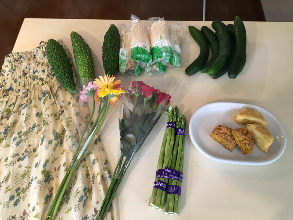 きゅうり6本100円、えのき5袋100円、ゴーヤ3本100円、インド綿スカート100円、ガーベラ5本100円、