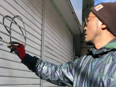 浪花寿司さんの隣のシャッターに迷うことなく筆を走らせるRAGA(ラガ)さん。「これどがんすっかね」と迷われないのか伺ったところ