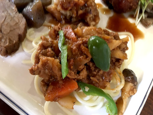 パスタの上に乗った青椒肉絲のような中華ソースが掛かったパスタが絶品!