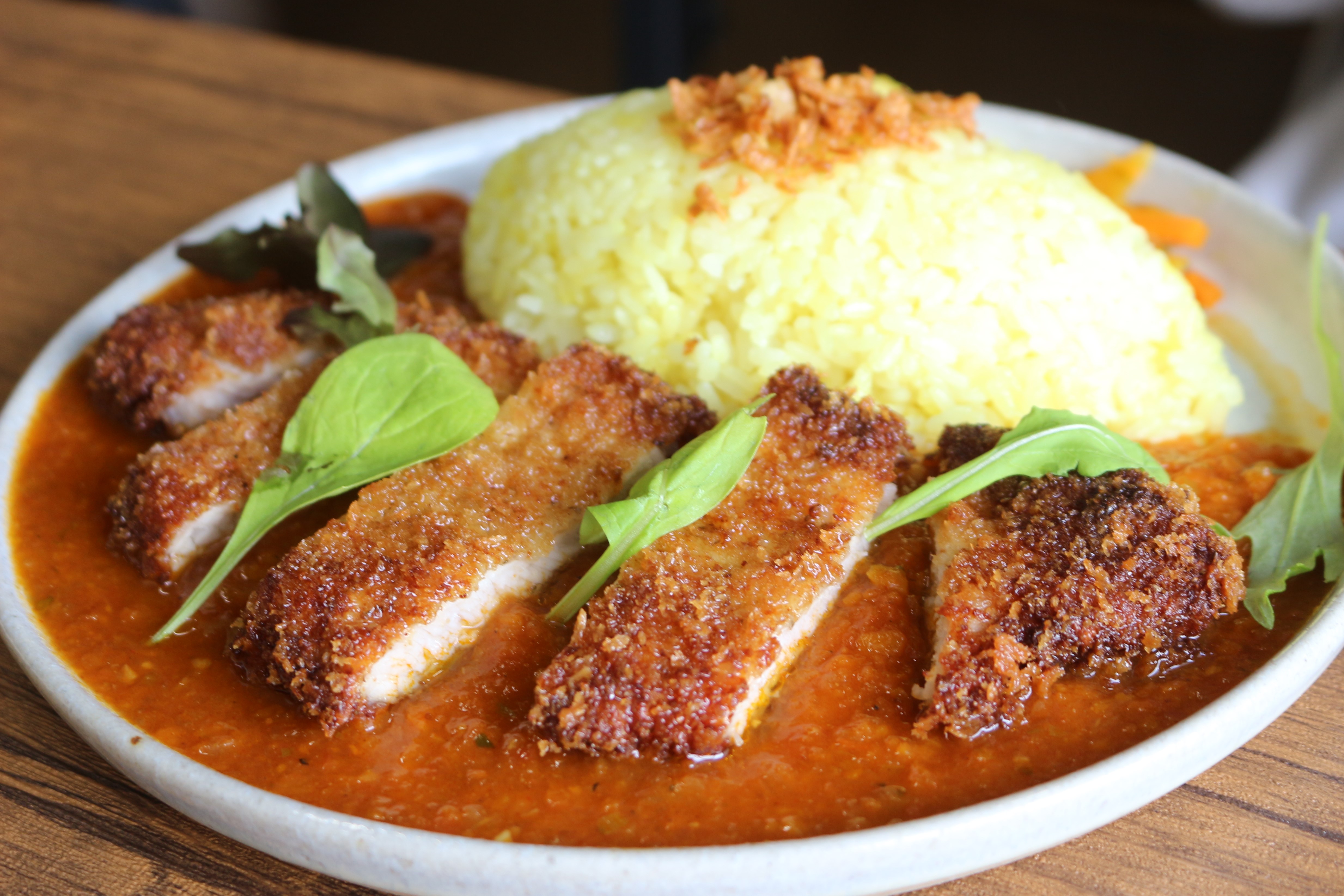 こちらは最近レギュラーメニューになったカツカレー。トマトベースのカレーで、やはり野菜がたっぷりと使われています。
