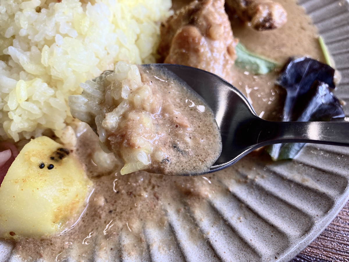 まるでスムージーみたいな感じで食材がたっぷり入っています。これは5~6種類の野菜をじっくり煮込んであるそうです。それゆえ、複雑な深みのあるルーになっています。野菜も旬によって使えるものが変わってくるのでカレーもちょっとずつ変わります。