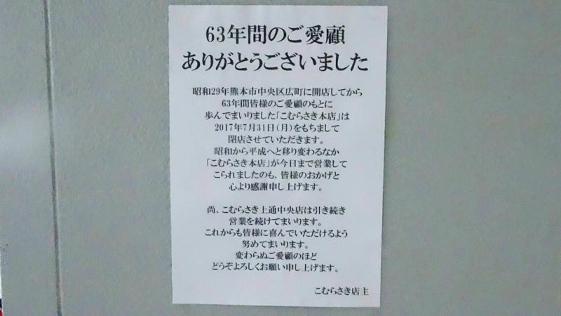 熊本ラーメンの最も古い店の一つとされる老舗ラーメン店「こむらさき」が7月いっぱいの営業だと言う事です。