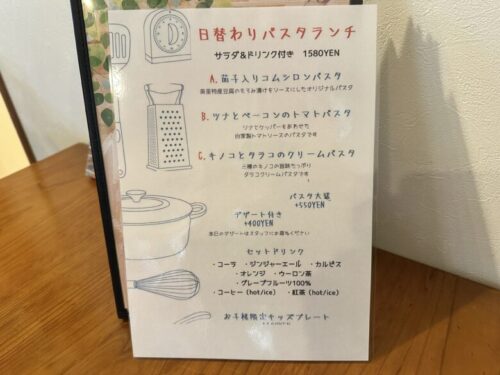 メニューはパスタ、ピザやデザートなど種類も豊富です!