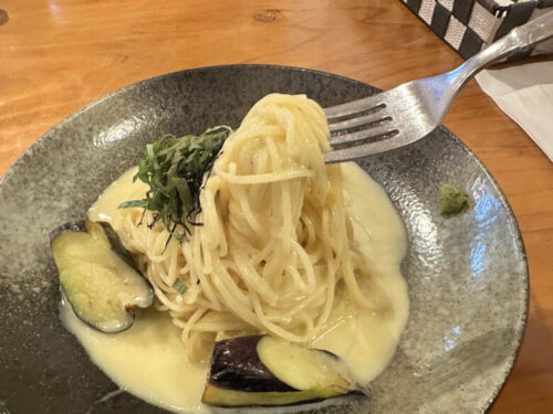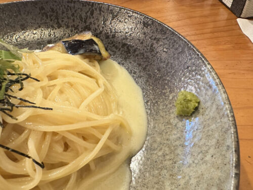 ワサビを入れて食べると、さっぱりと和風なパスタに変身。