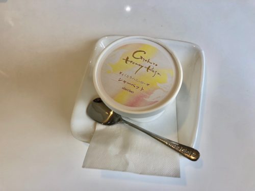 蓋を開ければ、ハニーローザの甘さがぎゅっと濃縮されているのが分かる綺麗な黄色のシャーベット。特有の爽やかな甘さの中に、すもも特有の酸味がほんのり。プチプチ食感の果肉の粒もたっぷり詰まっていますよ。
