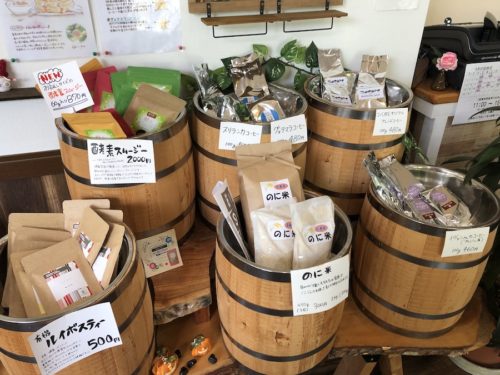 コーヒーは店内で購入もできます。自分で煎れて楽しむも良し、お土産にも良し!! ちなみに、真ん中で異彩を放つ「のに米」は、奇跡のフルーツと呼ばれる「ノニ」を使用して作ったお米。契約農家さんにお米の成長に合わせて、ノニジュースを使って育てた特別な米(地元の米)です。